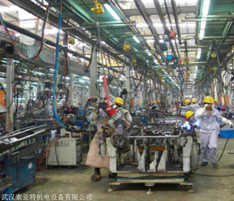 将控制箱悬挂点焊机一体化,构造连贯合理,节省了控制箱安装平台,使生产环境愈发干净美观。