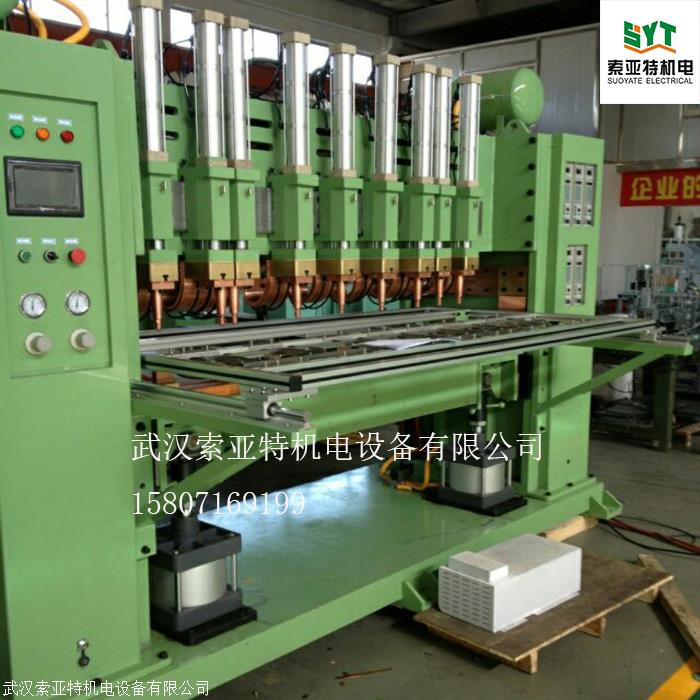 龙门型多点焊接机通过龙门架,双中频逆变焊接变压器,气动传动装置,伺服电机输送线体,电气控制系统,冷却系统和PLC连接。触摸屏操作系统控制系统。